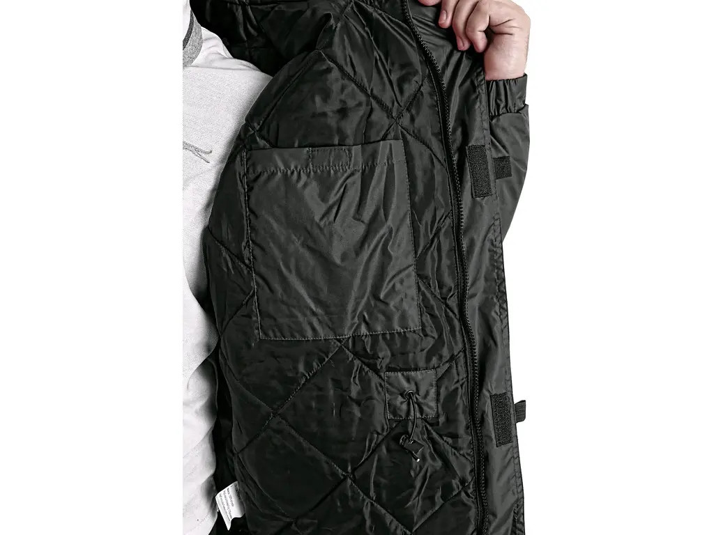 Pánská zateplená bunda, odolná proti vodě a větru, kapuce v límci, zapínaní na zip krytý légou, rukávy zakončené regulovatelnou manžetou, 2 náprsní kapsy kryté patkou, 4 spodní kapsy z toho dvě kapsy kryté patkou, dvě kapsy z boku, reflexní doplňky, stahování v pase, vnitřní náprsní kapsa, lepené švy.