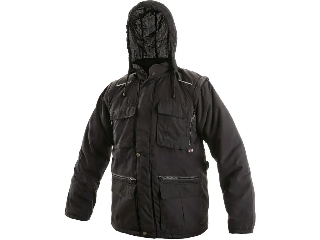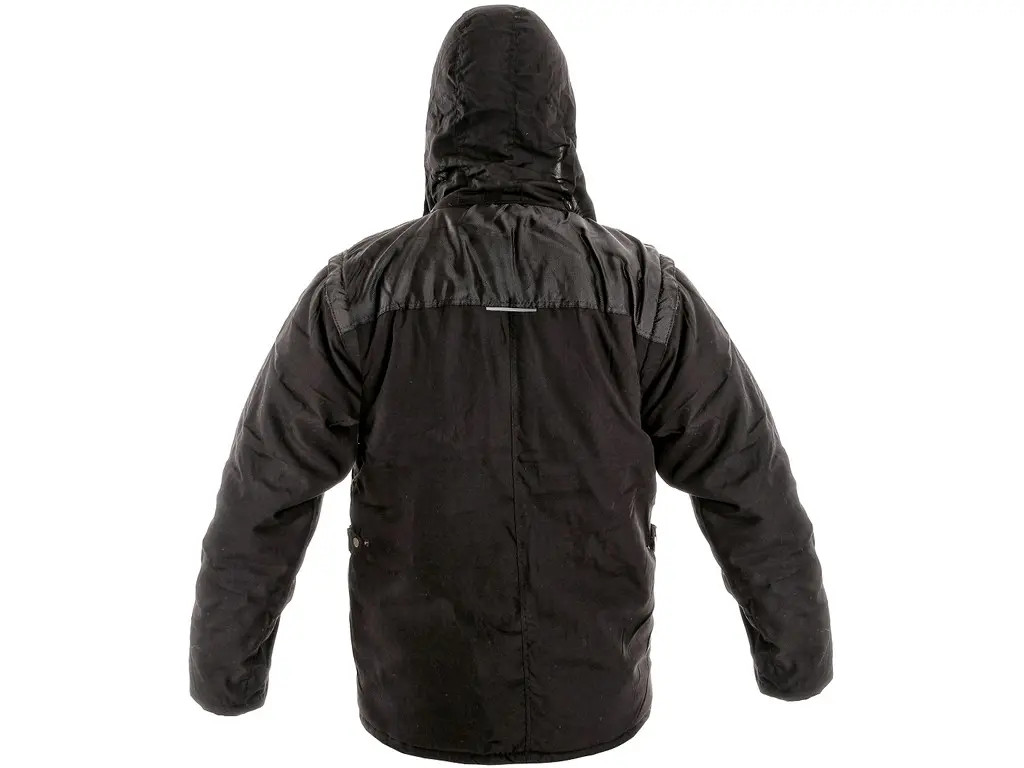 Pánská bunda 2 v 1, zateplená, kapuce v límci, zesílená ramena, odepínací rukávy s vnitřní manžetou, stahování v dolním okraji, reflexní doplňky, 2 vnitřní kapsy.