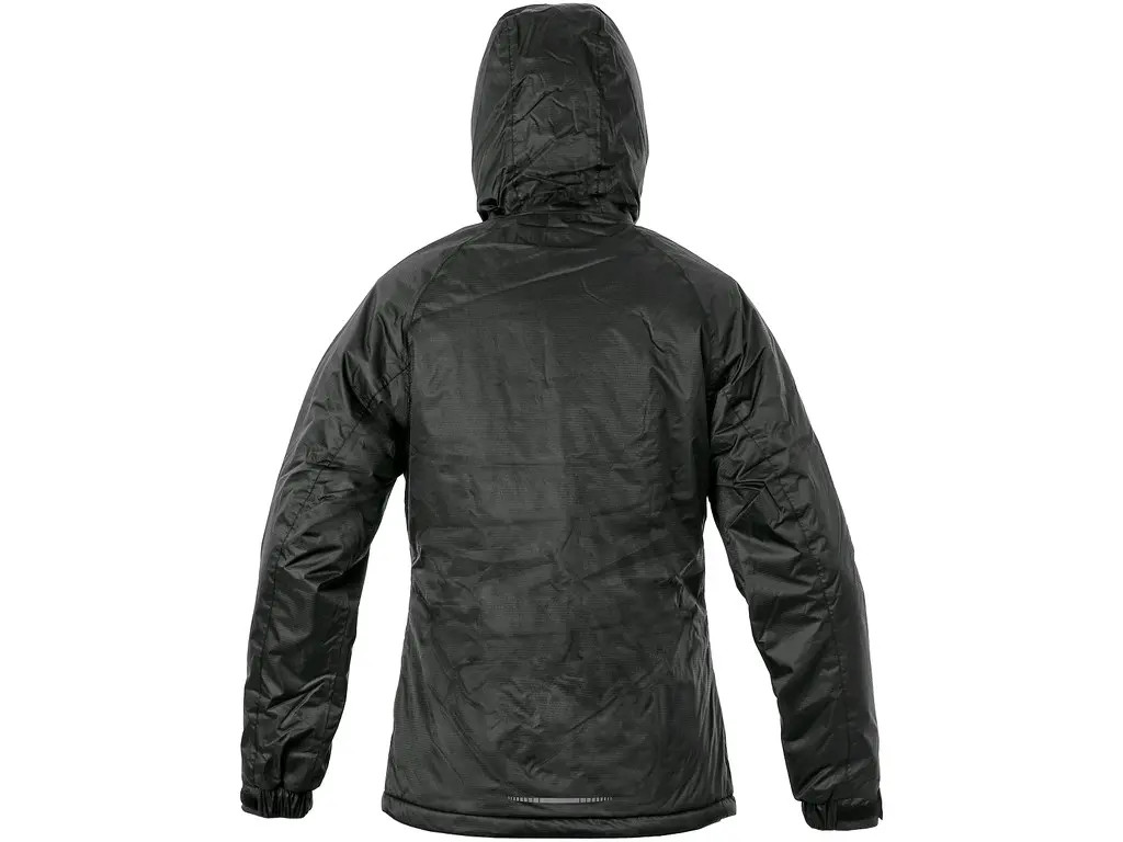Dámská zateplená bunda, odolná proti vodě a větru, kapuce napevno, regulovatelné manžety na rukávech, spodní kapsy na zip, reflexní doplňky, stahování v dolním okraji, vnitřní náprsní kapsa, lepené švy, odolnost materiálu proti průniku vody 2 000 mm, paropropustnost 2 000 g/m2/24h.
