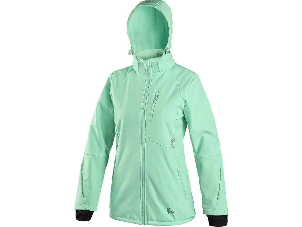 Dámská softshellová bunda s odepínací kapucí, odolná proti vodě a větru, zapínaní na zip, větrání v podpaží, náprsní kapsa na zip, boční kapsy na zip, rukávy s vnitřními manžetami, stahování v dolním okraji, reflexní doplňky, TPU membrána. Odolnost materiálu proti průniku vody 5 000 mm mimo oblast švů, paropropustnost 5 000 g/m2/24h.