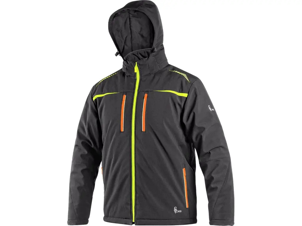 Pánská zateplená softshellová bunda s odepínací kapucí, odolná proti vodě a větru, zapínaní na zip, větrání v podpaží, náprsní kapsy na zip, v pravé kapse odnímatelné pouzdro na ID kartu, boční kapsy na zip, vnitřní kapsy, vnitřní manžety v rukávech, stahování v dolním okraji, reflexní doplňky, TPU membrána, vnitřní otvor na zip pro aplikaci výšivky. Odolnost materiálu proti průniku vody 8 000 mm mimo oblast švů, paropropustnost 3 000 g/m2/24h.