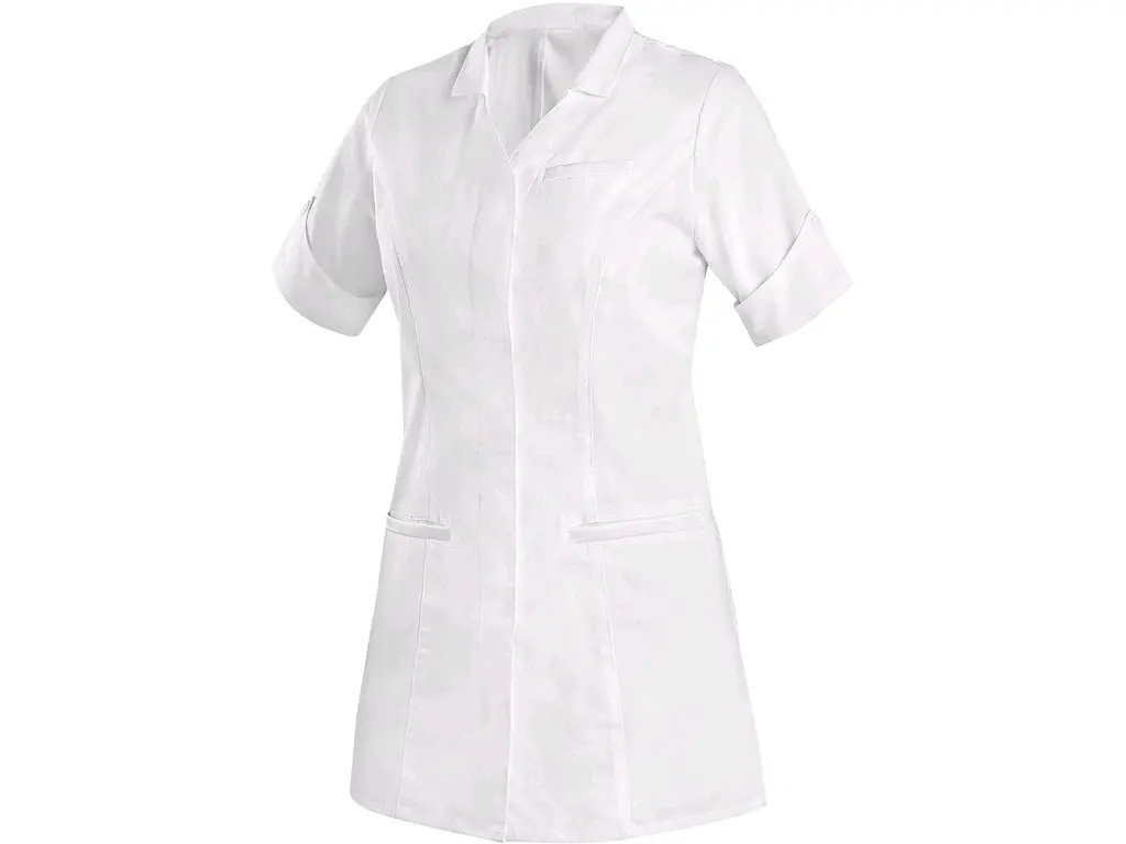 Dámská halena s krátkým rukávem, princesový střih, kryté zapínání na knoflíky, 3 přední kapsy zdobené saténovým lemováním. Doporučené použití: wellness, kosmetické salóny, soukromé ordinace, kliniky a velká zdravotnická zařízení, záchranné a zdravotní dopravní služby, lázeňská zařízení, ústavy sociální péče, lékárny, školy se zdravotnickým a gastro zaměřením.