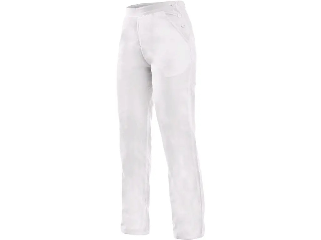 Dámské kalhoty, pevný pas, boční zapínání na knoflíky, 2 přední kapsy. Doporučené použití: soukromé ordinace, kliniky a velká zdravotnická zařízení, záchranné a zdravotní dopravní služby, lázeňská zařízení, ústavy sociální péče, lékárny, školy se zdravotnickým a gastro zaměřením.