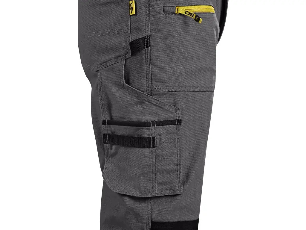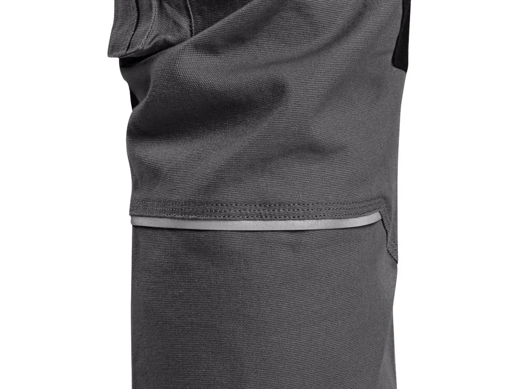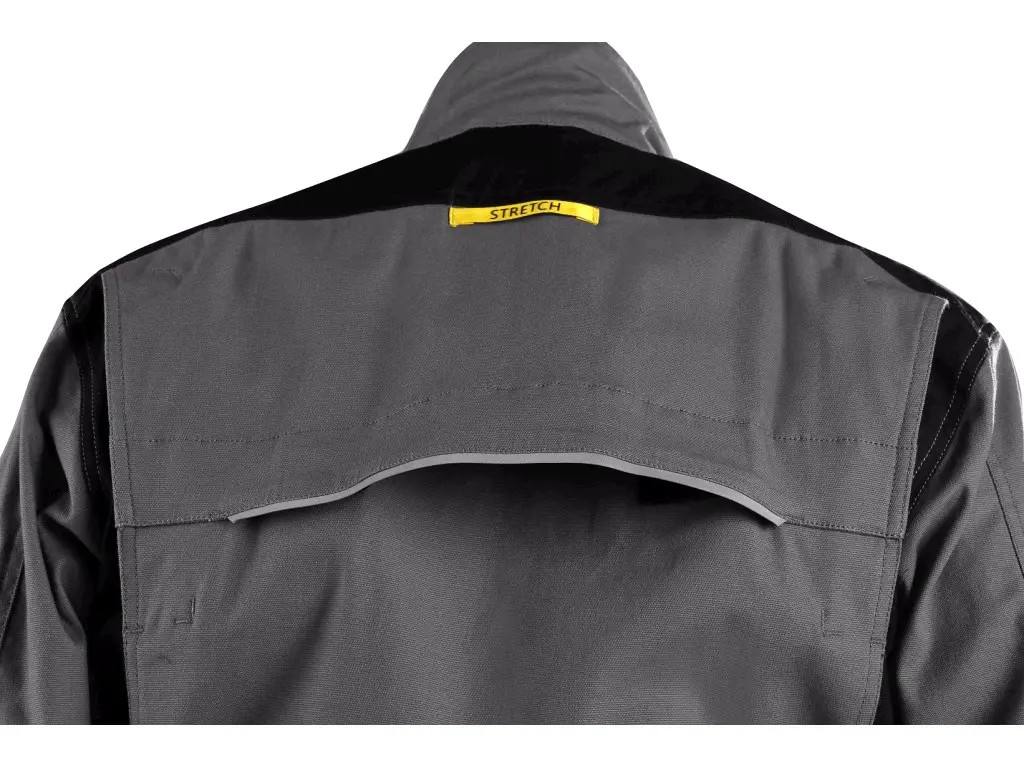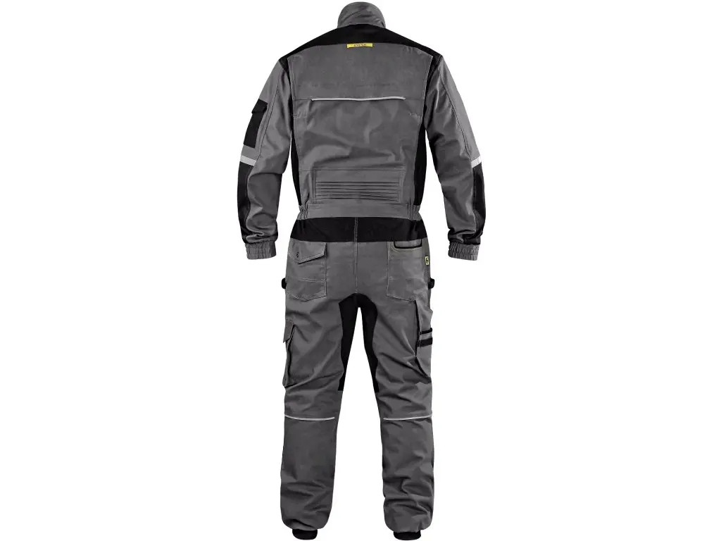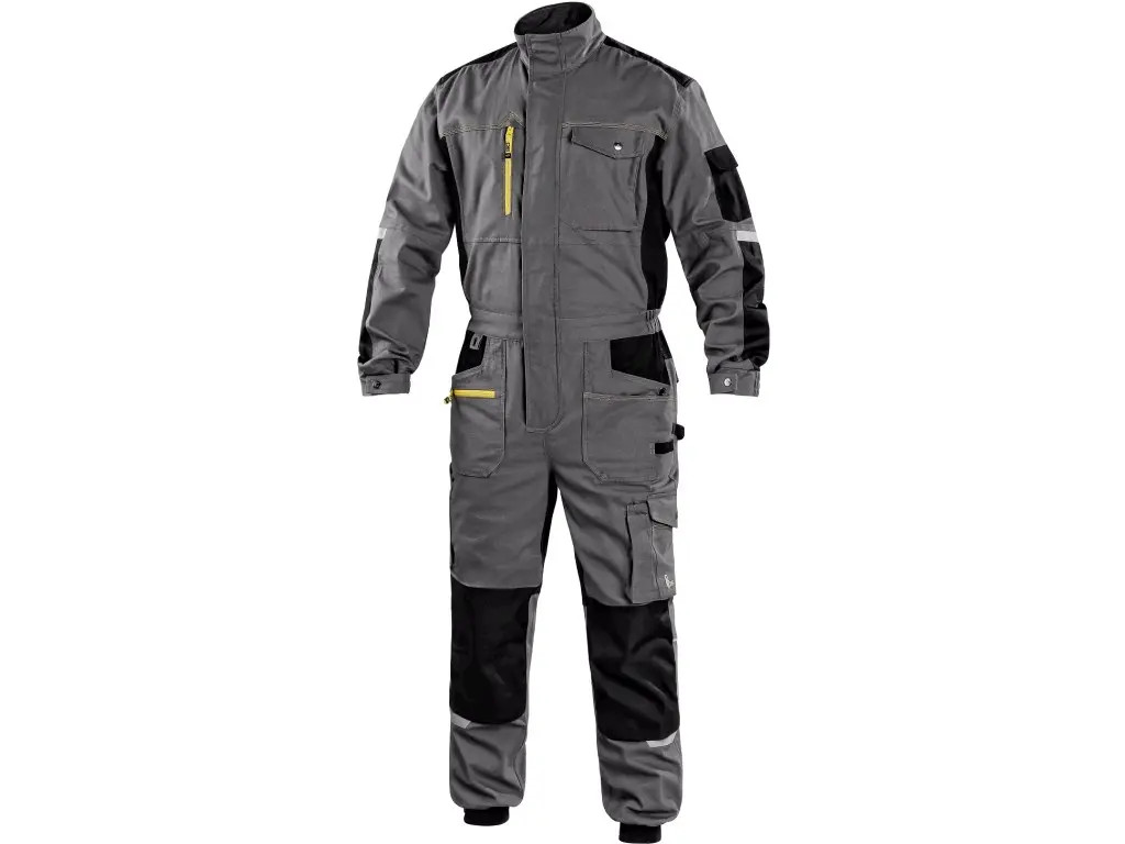Pánská pracovní kombinéza, strečová tkanina umožňující volný pohyb, ramena vyztužena 600D polyesterem, rukávy s nastavitelnou manžetou, kapsička s klopou na levém rukávu, kryté zapínání na zip a druky, náprsní kapsy - na druk a zip, dvoucestný zip, ventilace na zádech, pas s gumou v bocích, přední kapsy s kapsou na zip, multifunkční kapsy na obou stranách, kolena zesílena 600D polyesterem s možností vložení kolenních výztuh, dvě zadní kapsy, jedna s klopou, pružná manžeta na nohavicích, reflexní doplňky.