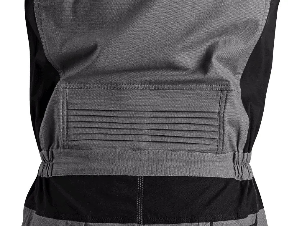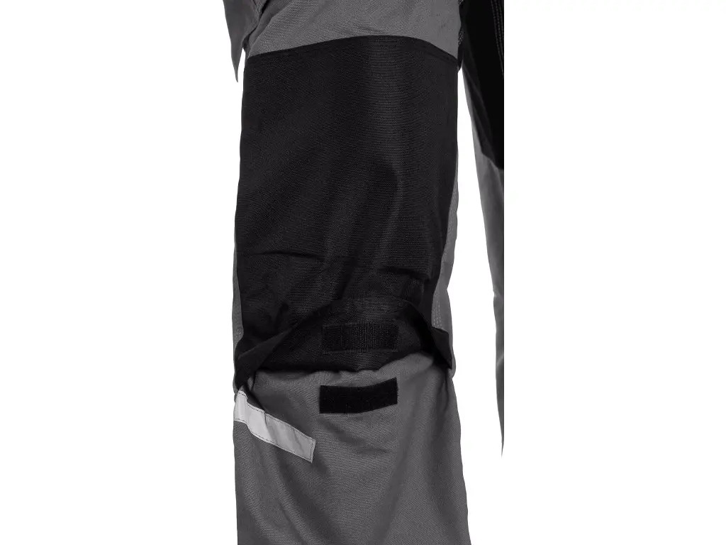 Pánská pracovní kombinéza, strečová tkanina umožňující volný pohyb, ramena vyztužena 600D polyesterem, rukávy s nastavitelnou manžetou, kapsička s klopou na levém rukávu, kryté zapínání na zip a druky, náprsní kapsy - na druk a zip, dvoucestný zip, ventilace na zádech, pas s gumou v bocích, přední kapsy s kapsou na zip, multifunkční kapsy na obou stranách, kolena zesílena 600D polyesterem s možností vložení kolenních výztuh, dvě zadní kapsy, jedna s klopou, pružná manžeta na nohavicích, reflexní doplňky.