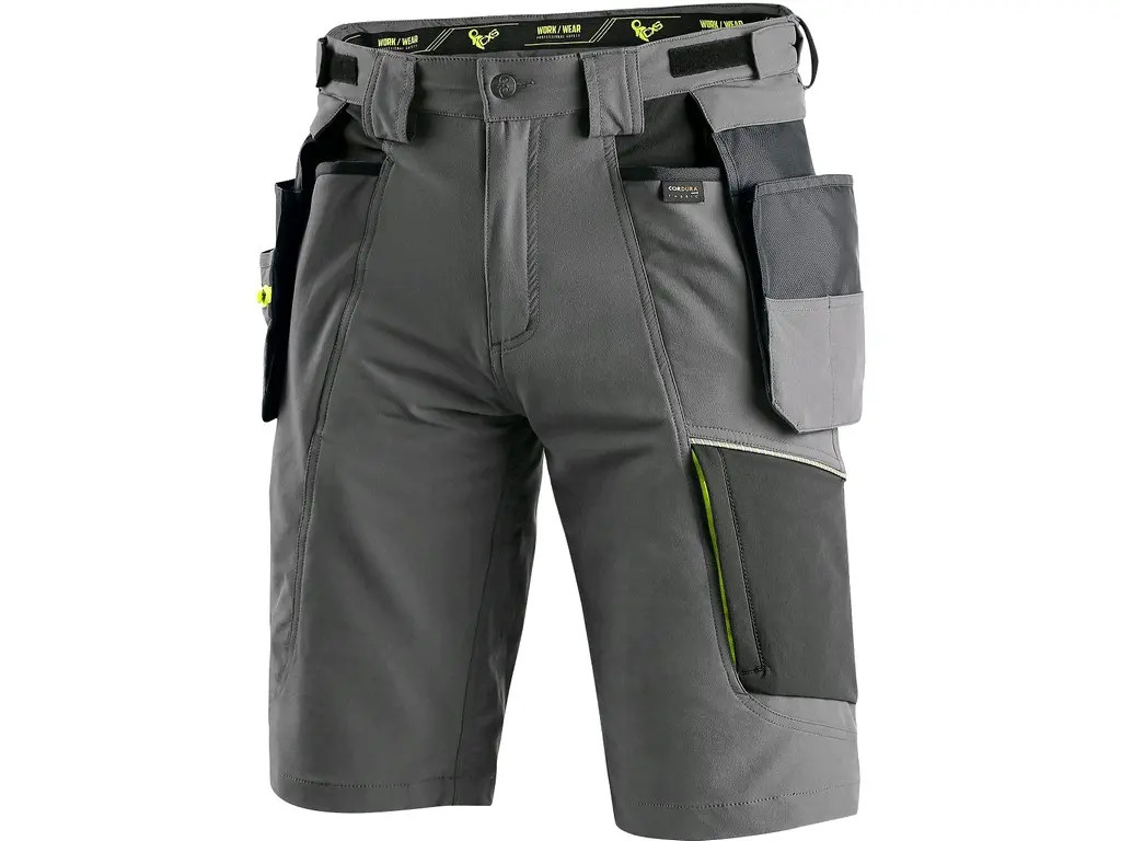 Pánské montérkové kraťasy s kontrastními barevnými a reflexními doplňky. Konstrukce 4-way stretch umožňuje roztahování materiálu ve všech čtyřech směrech a tím i snadný a volný pohyb. Vysoké procento nylonu zaručuje schopnost rychlého schnutí. Vybavení: flexibilní pas s možností upravení velikosti a poutky na opasek, 2 přední kapsy, 2 odnímatelné kapsy na nářadí vyztuženy materiálem CORDURA, kapsa na zip na stehně, multifunkční boční kapsa, 2 zadní kapsy ve spodní části vyztuženy materiálem CORDURA.