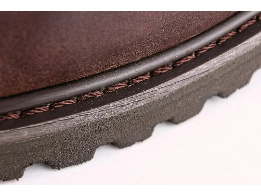 Pracovní polobotka, celokožená bez ocelové špice. Materiál: svršek z 1,6 - 1,8 mm činěné hovězí Crazy horse kůže, unikátní konstrukce Goodyear welted (prošitá podešev), podšívka: prodyšná oděru odolná polyesterová textilie, podešev: gumová, olejivzdorná, protiskluzová.