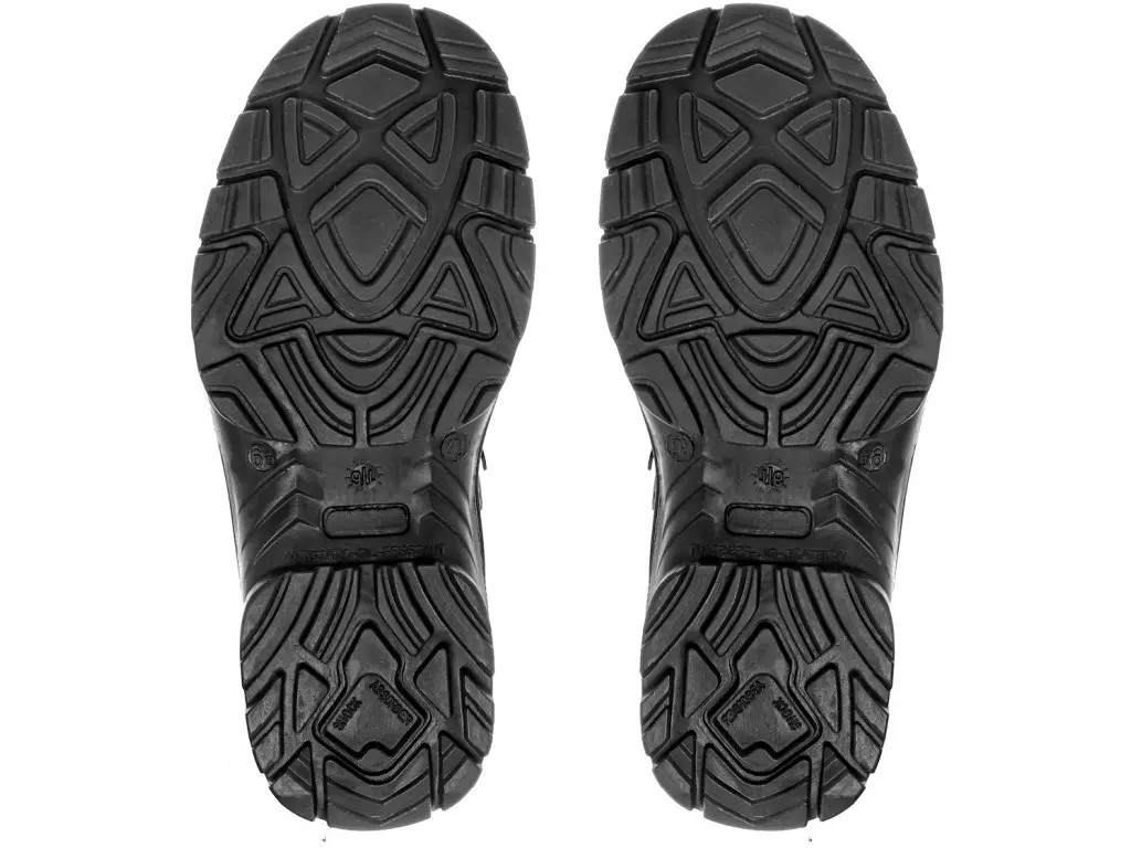 Kotníková bezpečnostní obuv, zimní, s ocelovou špicí a planžetou. Materiál: svršek z 1,8 - 2 mm hydrofobní lícové kůže s reflexním PVC páskem, textilní prodyšná podšívka zateplená syntetickým kožíškem, podešev: PU-PU, olejivzdorná, antistatická, protiskluzová, odolná proti propichu.