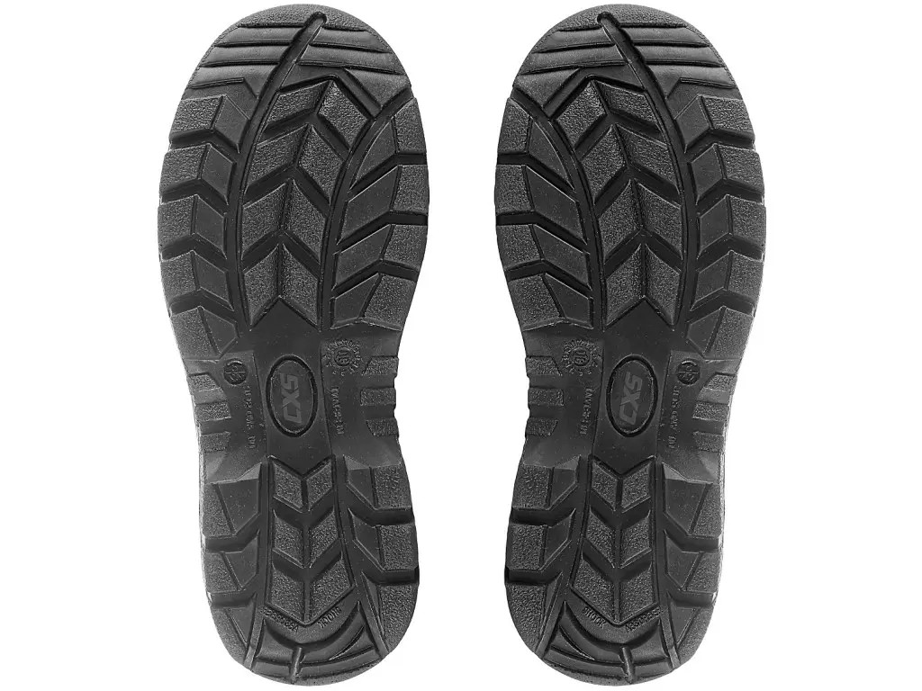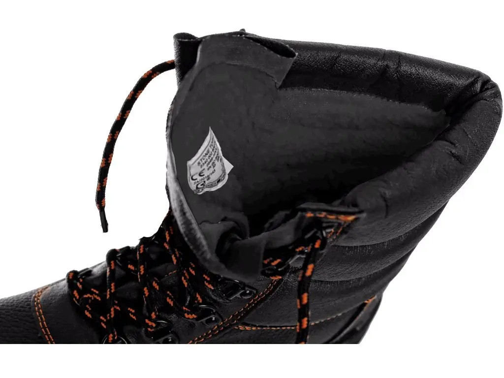 Poloholeňová obuv, zimní, celokožená s ocelovou špicí a planžetou, reflexní doplňky. Materiál: hydrofobní svršek z 1,6 - 1,8 mm hovězí štípenkové tištěné kůže, podšívka Cambrelle zateplená umělým kožíškem, podešev: PU-PU olejivzdorná, antistatická, protiskluzová, odolná proti propichu.