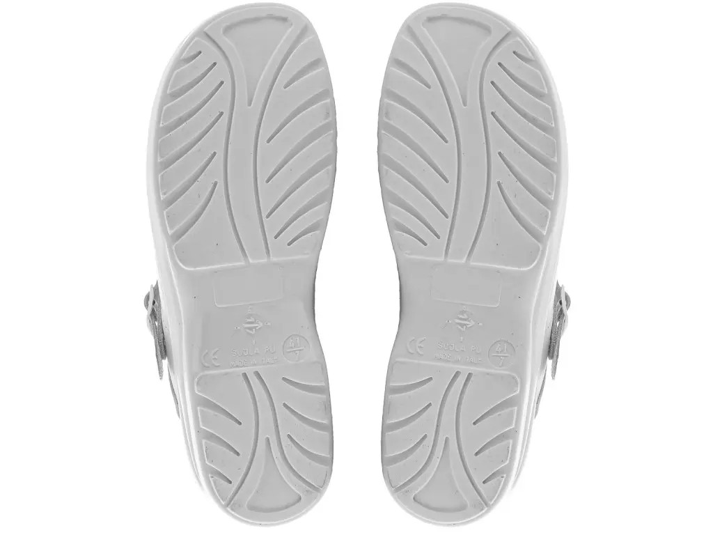 Sandál, dámský, kožený s plnou špicí, perforovaný s polohovatelným páskem kolem paty. Materiál: svršek z přírodní lícové úsně, antistatická, protiskluzová PU podešev.