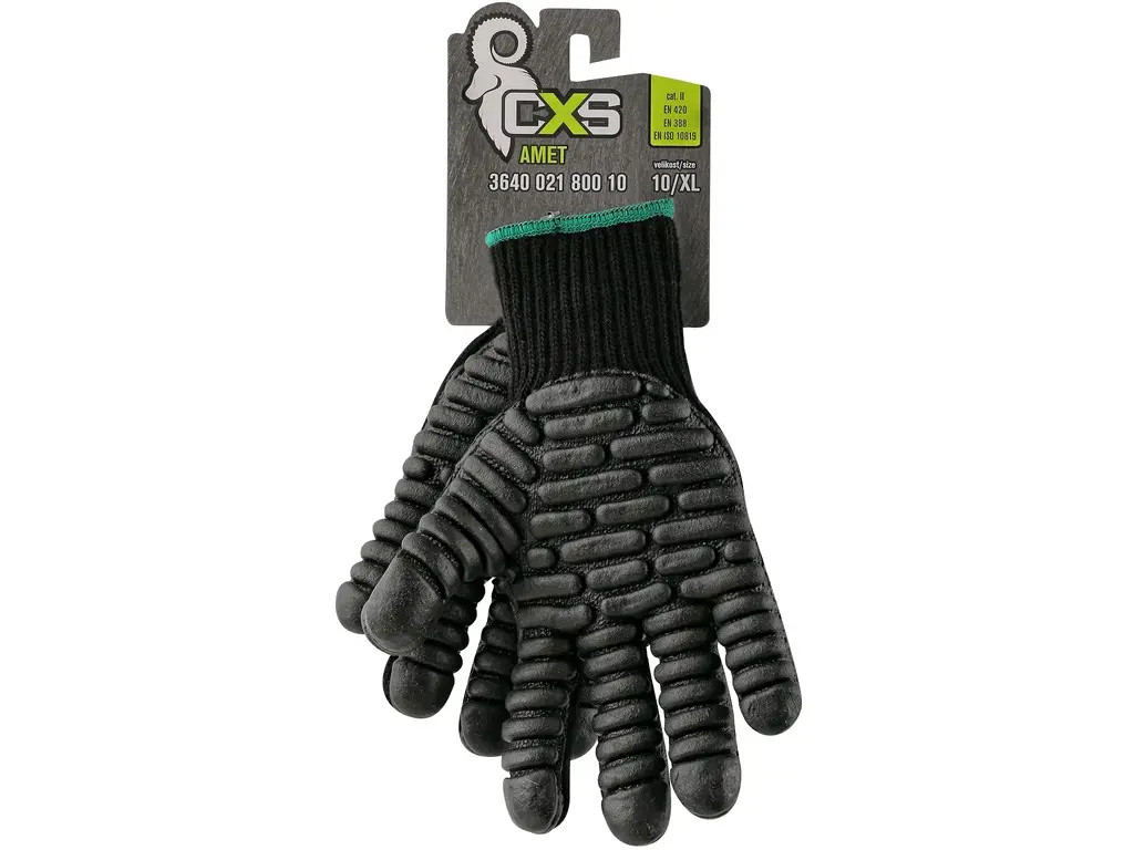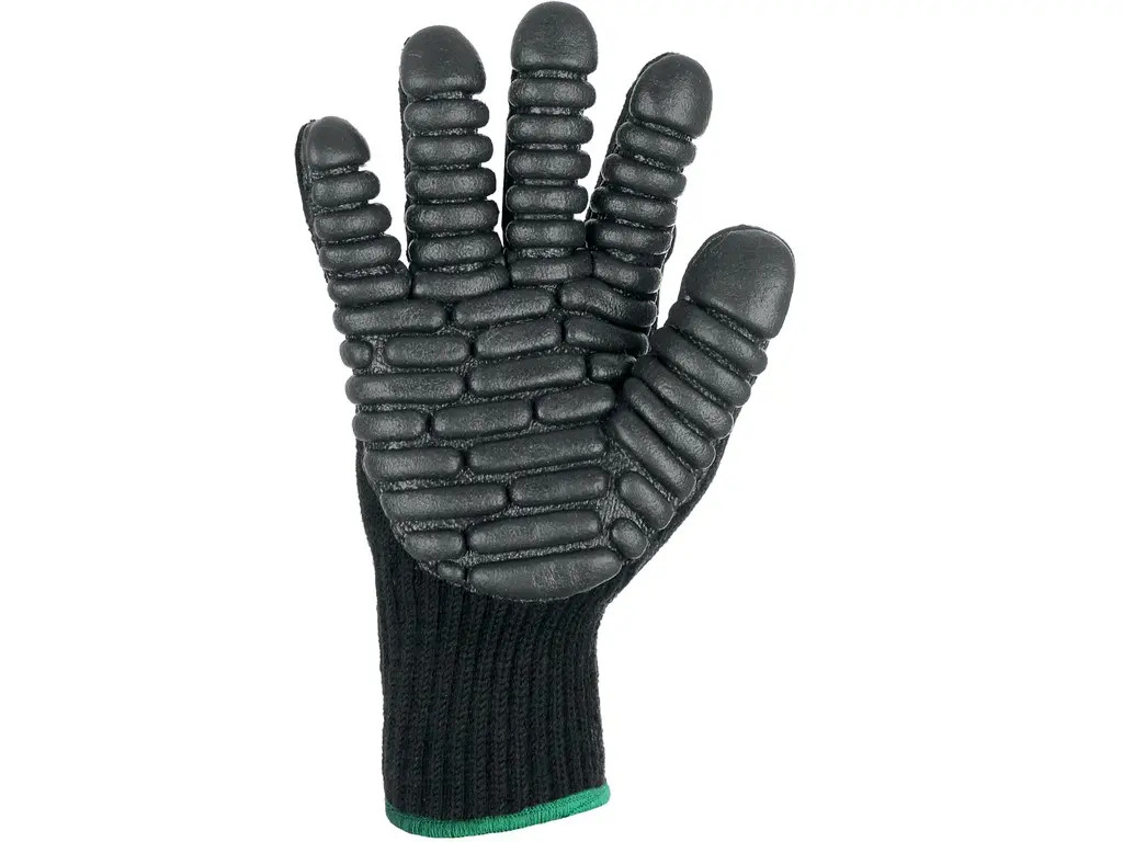 Pletené rukavice s antivibračními polštářky z pěnového latexu v dlani, pružná manžeta. Baleny s blistrem. Doporučené aplikace: práce s vibračním nářadím, údržba zeleně, práce s motorovou pilou, silniční vrtačky, ponorné vibrační stroje, brusky.