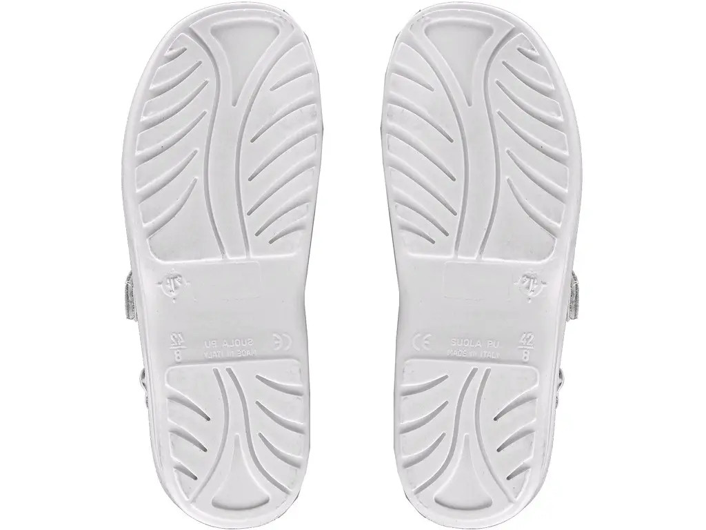 Sandál, dámský, kožený s plnou špicí, perforovaný s přezkou na suchý zip a páskem kolem paty. Materiál: svršek z přírodní úsně, antistatická, protiskluzová PU podešev.