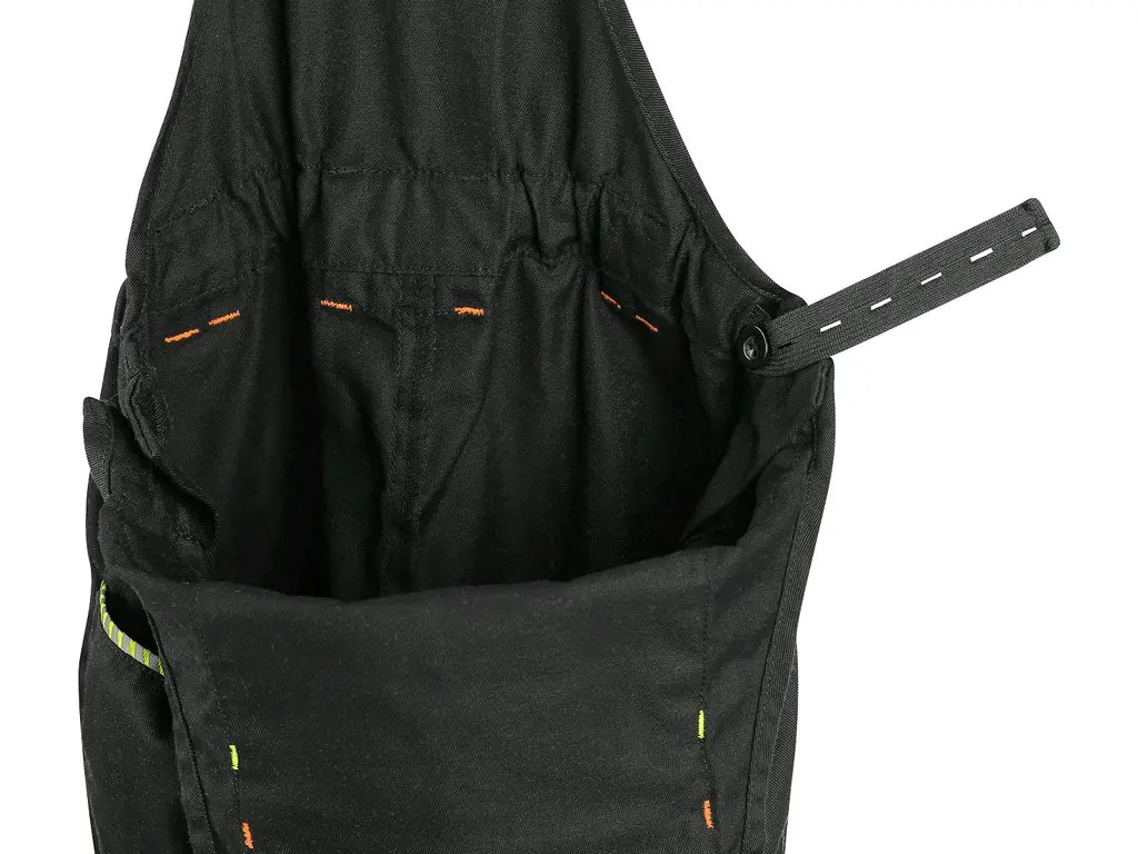 Dětské kalhoty s náprsenkou, náprsní kapsa na zip s menšími kapsičkami, pas s poutky na opasek, boční zapínání na knoflíky, v zadní části guma s knoflíkem pro přizpůsobení velikosti, přední klínové kapsy, kapsy na tužky a drobné předměty na levém stehni, zipová kapsa na pravém stehni, zadní jednoduchá kapsa, šle vzadu do gumy, reflexní doplňky.