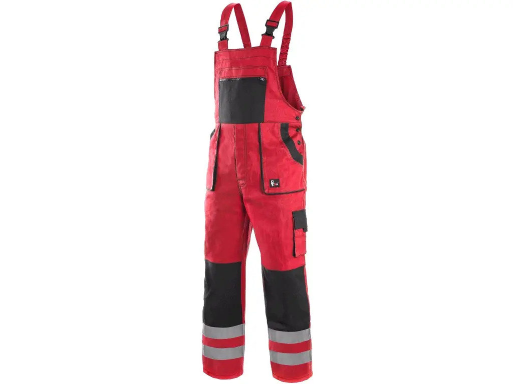 Pánské montérkové kalhoty s náprsenkou, náprsní kapsa na zip, pas vzadu do gumy, přední kapsy, boční kapsa na svinovací / skládací metr, boční kapsa na mobil / peněženku, zdvojená kolena, zadní kapsa s klopou, šle s gumou vzadu, reflexní pruhy. Doporučené použití: strojírenství, stavebnictví, lehký průmysl, automobilový průmysl, logistika, skladová manipulace, spedice, autoservisy, údržba, montáže, zemědělství, zahrada, hobby.