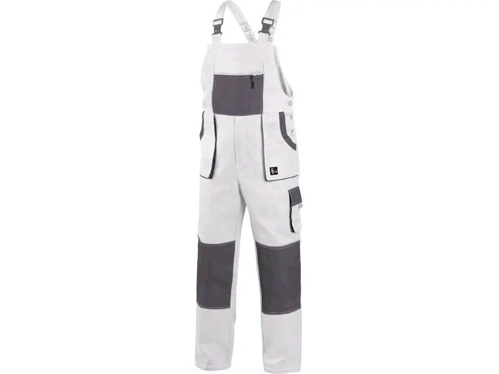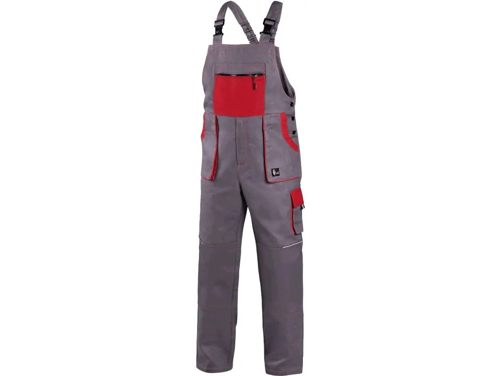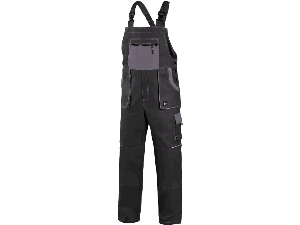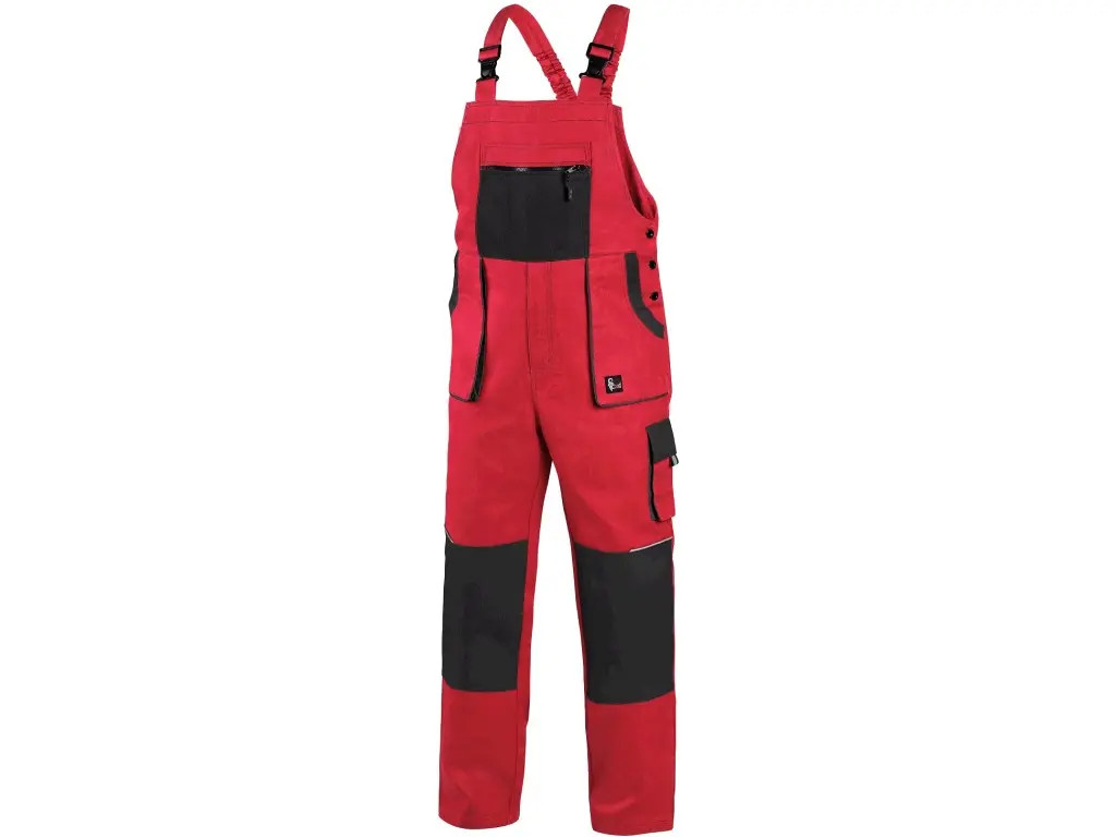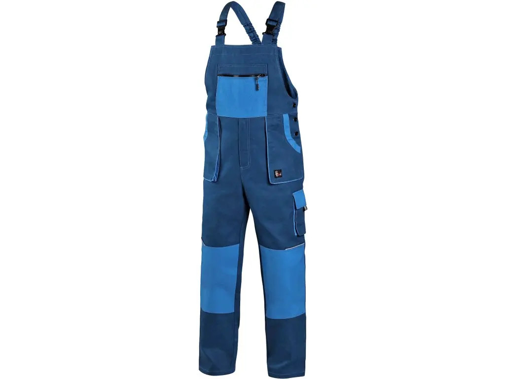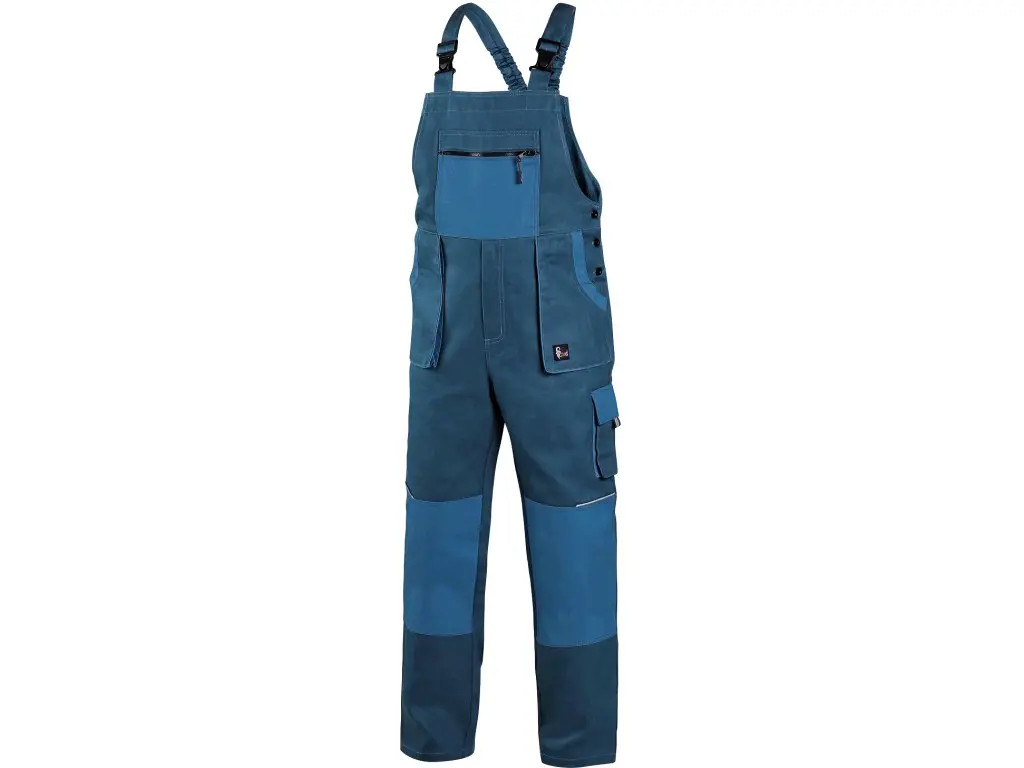 Pánské s náprsenkou, zdvojená kolena, přední Pánské montérkové kalhoty s náprsenkou, náprsní kapsa na zip, pas vzadu do gumy, přední kapsy, boční kapsa na svinovací / skládací metr, boční kapsa na mobil / peněženku, zdvojená kolena, zadní kapsa s klopou, šle s gumou vzadu, reflexní doplňky. Doporučené použití: stavebnictví, lehký průmysl, logistika, skladová manipulace, autoservisy, údržba, montáže, zemědělství, zahrada, hobby. kapsy, náprsní kapsa na zip, boční kapsy na metr a na mobil, pas v zadní části do gumy.