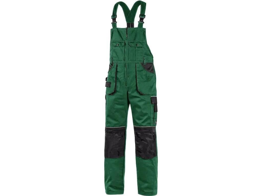 Pánské montérkové kalhoty s náprsenkou, náprsní kapsy s klopami, pas s poutky na opasek, vzadu do gumy, přední kapsy s poutky na nářadí, multifunkční kapsy na obou stranách, kolena zesílena 600D polyesterem s možností vložení kolenních výztuh, dvě zadní kapsy, jedna na suchý zip, šle s gumou vzadu, reflexní doplňky. Doporučené použití: stavebnictví, strojírenství, lehký průmysl, automobilový průmysl, logistika, skladová manipulace, spedice, autoservisy, údržba, montáže, zemědělství, zahrada, hobby.