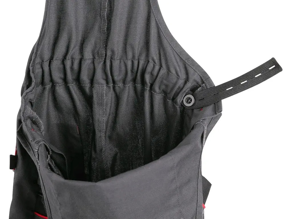 Dětské kalhoty s náprsenkou, z lehkého materiálu, náprsní kapsa na zip, boční zapínání na knoflíky, v zadní části guma s knoflíkem pro přizpůsobení velikosti, přední klínové kapsy, zadní jednoduchá kapsa, zesílená kolena, šle vzadu do gumy, reflexní doplňky.