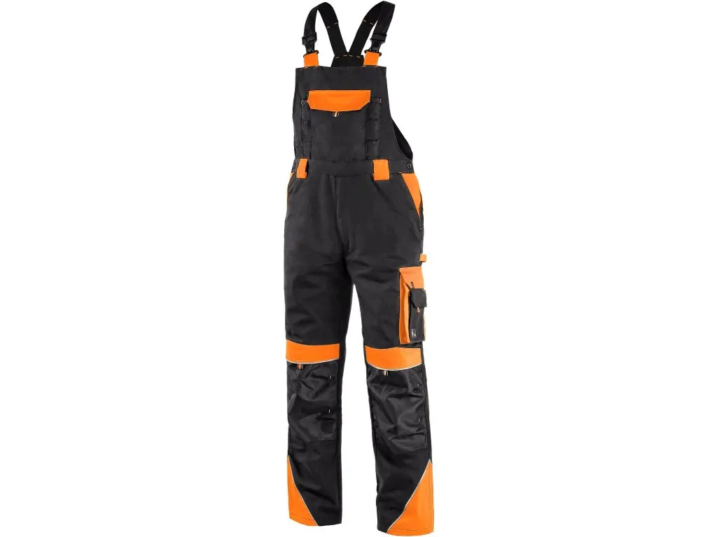 Pánské montérkové kalhoty s náprsenkou, náprsní kapsa s klopou, pas s poutky na opasek, v zadní části guma s knoflíkem pro přizpůsobení velikosti, přední klínové kapsy, multifunkční kapsy na obou stranách, kolena zesílena materiálem 600D polyester s možností vložení kolenních výztuh, dvě zadní kapsy s klopami, spodní část nohavic vyztužena materiálem 600D polyester, šle s gumou vzadu, reflexní doplňky. Doporučené použití: stavebnictví, strojírenství, lehký průmysl, automobilový průmysl, logistika, skladová manipulace, spedice, autoservisy, údržba, montáže, zemědělství, zahrada, hobby.