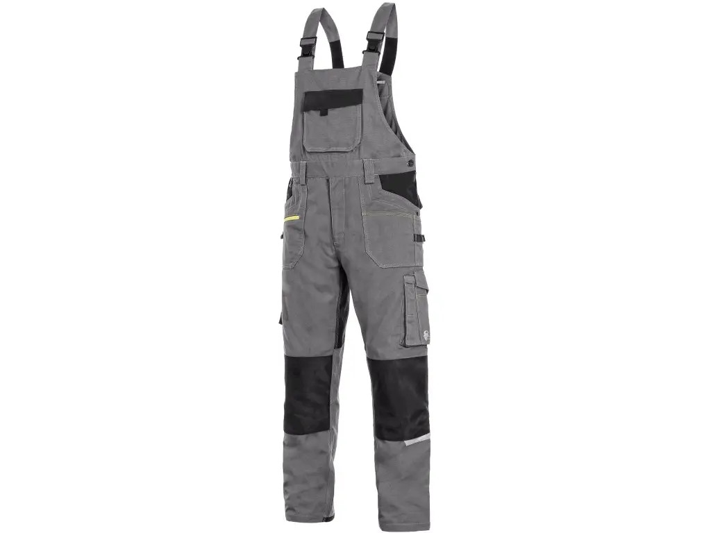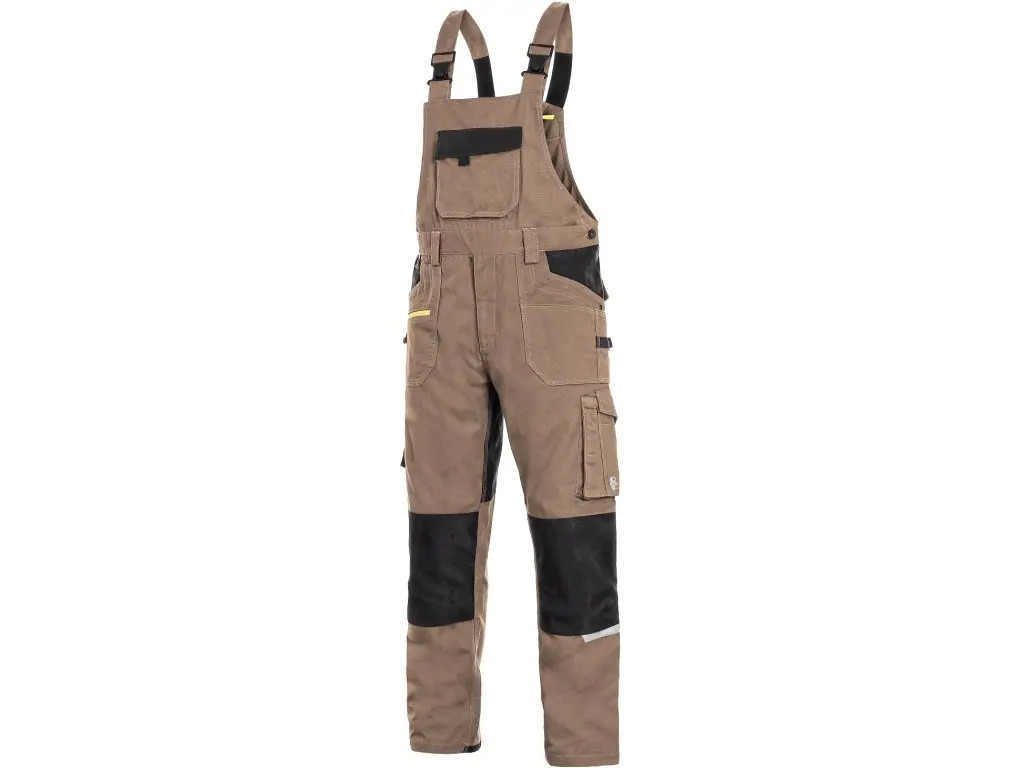 Pánské montérkové kalhoty s náprsenkou, strečová tkanina umožňující volný pohyb, náprsní kapsa s klopou, pas s poutky na opasek, přední kapsy s kapsou na zip, multifunkční kapsy na obou stranách, kolena zesílena 600D polyesterem s možností vložení kolenních výztuh, dvě zadní kapsy - jedna s klopou, zadní spodní lem nohavice vyztužen 600D polyesterem, šle s gumou vzadu, reflexní doplňky. Doporučené použití:
